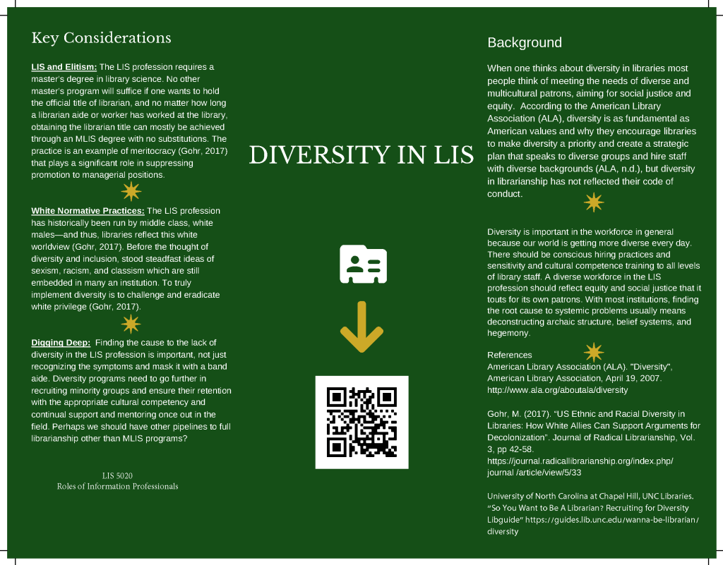 This is an informational poster I created detailing the emerging roles of change management: Diversity in LIS.